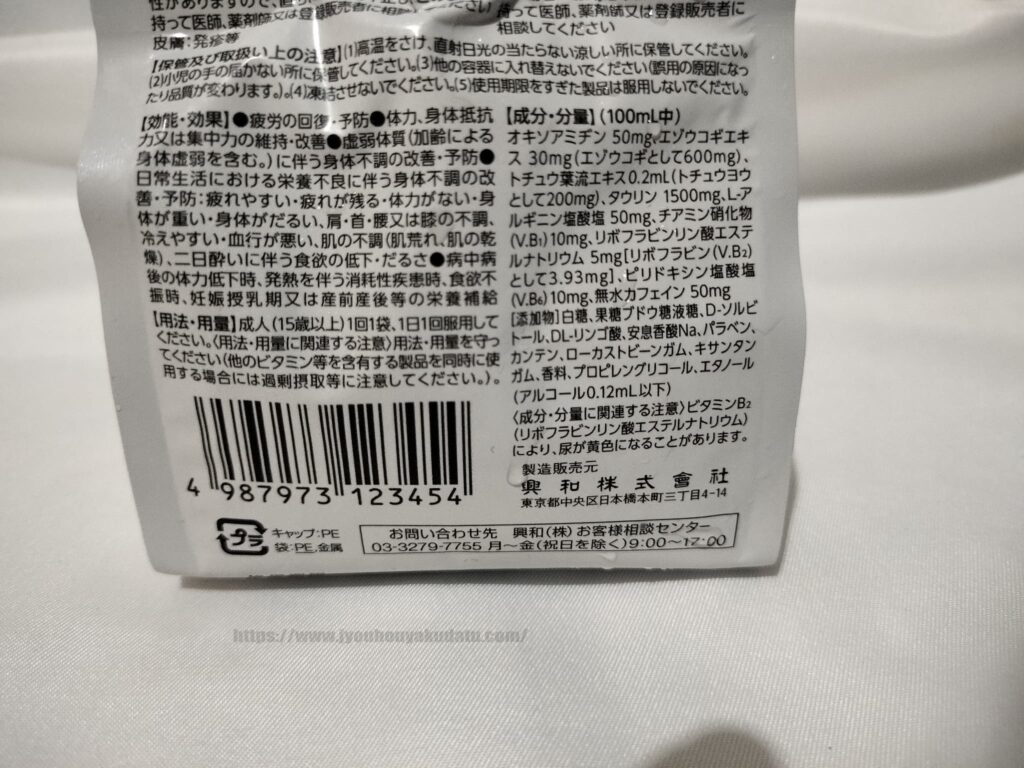 パッケージを見ると、3種のビタミン、3種の生薬、2種のアミノ酸が配合されていると書かれています。